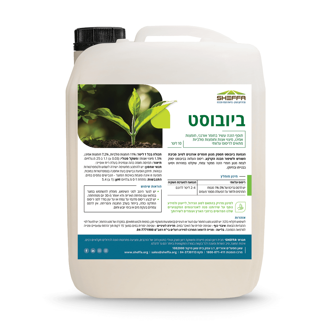 | 0 | 5.4 | 1.11 | 11% חומצות פולביות, 7.2% חומצות אמינו, 1.5% מיצוי אצות | כל הגידולים, יעיל במיוחד בקרקעות קלות ועניות | ריסוס עלוותי – יש לרסס בריכוז של 1%-3% מנפח התרסיס ולחזור על הפעולה מספר פעמים הגמעה במערכת ההשקיה – 2-4 ליטר לדונם |